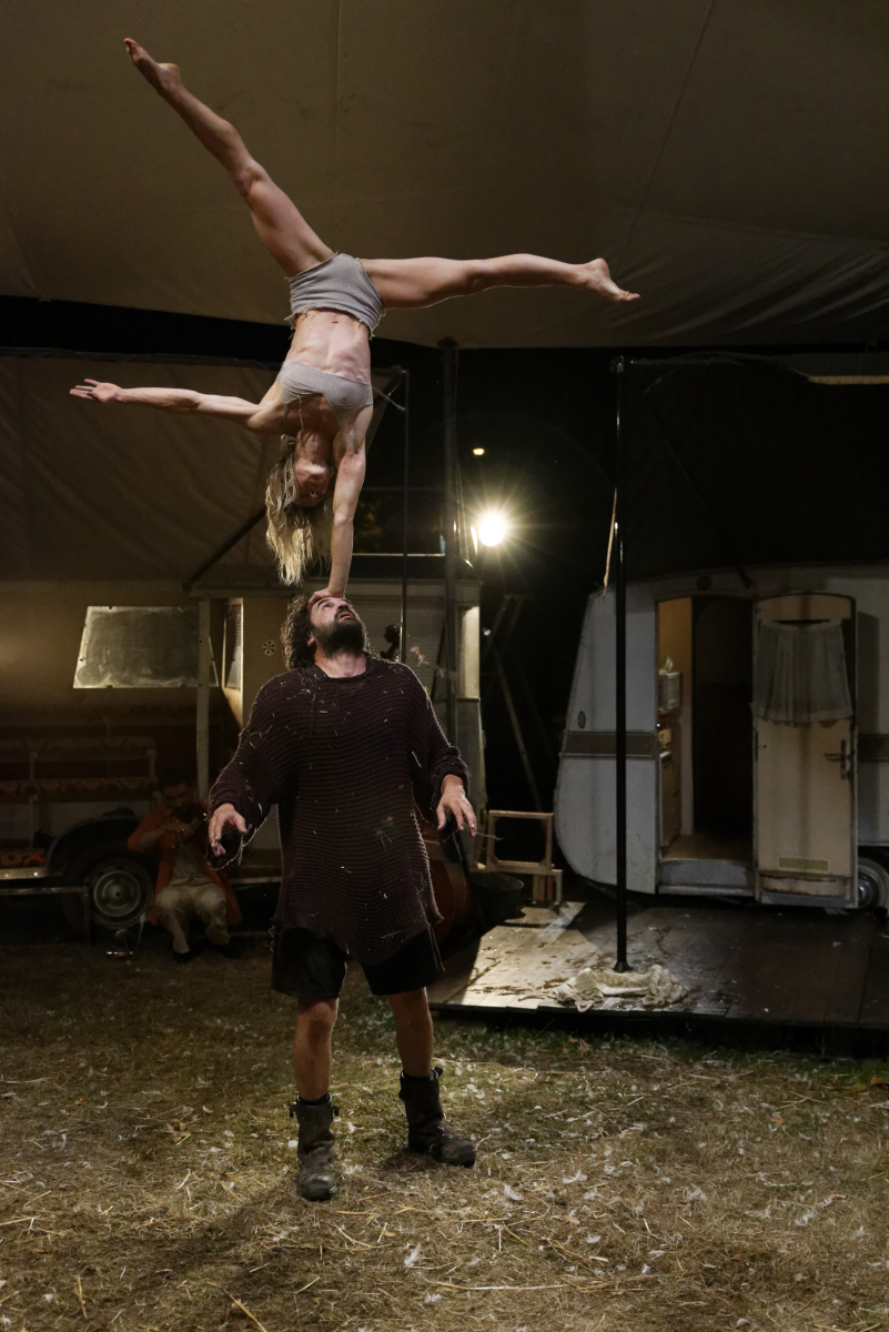 Des roulottes, des gradins, mais pas de chapiteau : c’est « à ciel ouvert » que se joue ce spectacle, dans un campement aux allures de cour de ferme. Ici, les portes claquent, le chaudron fume, les poules se baladent en liberté, et les humains courent avec une cloche accrochée au cou… avant de se lancer dans une séance de yoga version fakir, ou d’enchaîner quelques prouesses à la bascule, aux portés acrobatiques ou au mât chinois.