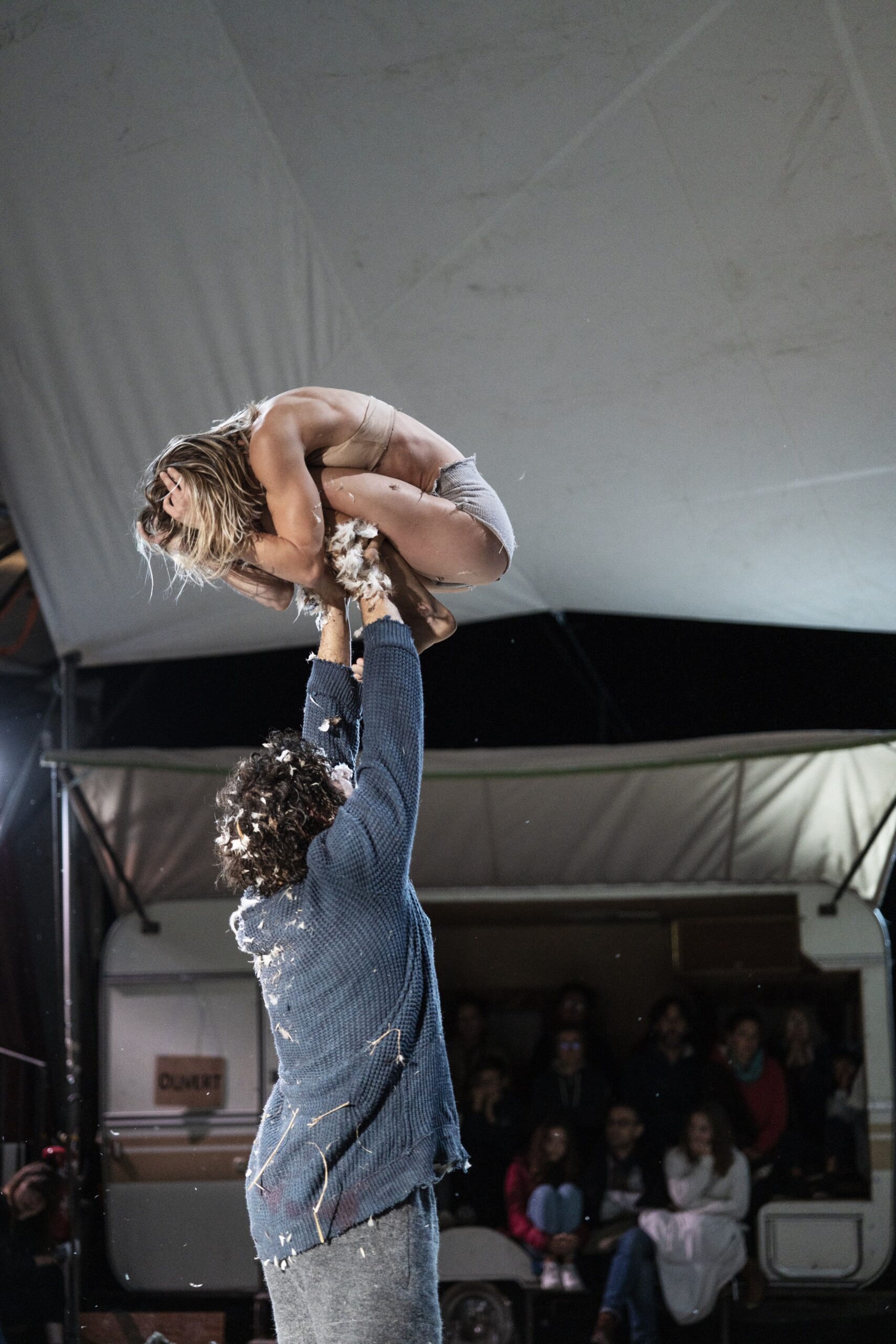À ciel ouvert, c’est la nouvelle création du Cirque Aïtal, duo formé par Kati Pikkarainen, voltigeuse finlandaise format poids plume, et Victor Cathala, porteur catalan à la carrure de colosse. Rejoints ici par deux musiciens, l’un au violon et l’autre à la contrebasse, ils inventent un spectacle imprévisible et plein de poésie, où le cirque se met au service de la vie nomade.