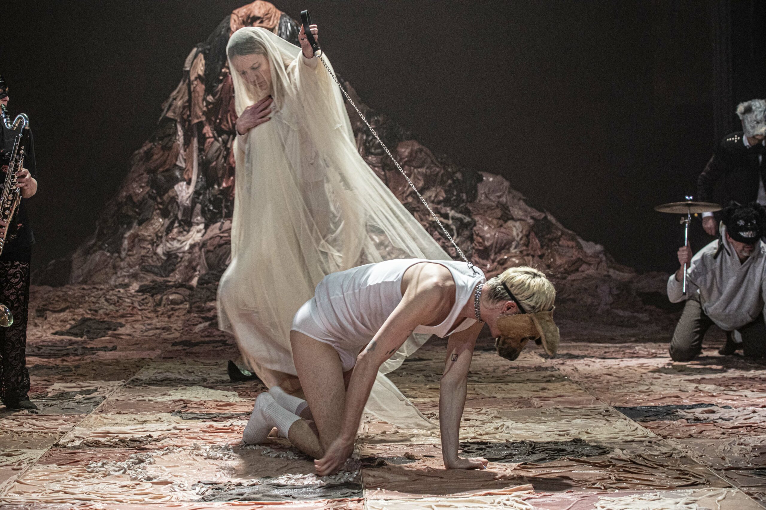 Chiens tente de remettre au centre les victimes inaudibles d’un système de représentations et d’opérer des points de bascule. La confrontation oxymorique entre la forme liturgique de la musique et son dialogue avec la pornographie met la violence à nu, tourne la norme en ridicule, conteste, reprend possession de ses conflits confisqués, s’affranchit.