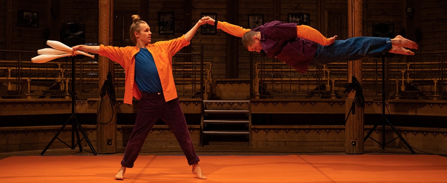 BasarKus n’est pas un être comme les autres ! Créature à deux têtes et multiples jambes, il a aussi plein de bras. D’aventures en aventures, il roule sur lui-même à l’infini. Il en a toujours été ainsi. Il est heureux comme ça, en parfaite harmonie avec lui-même. Mais en découvrant qu’il a deux cœurs, BasarKus s’interroge. Et s’ils étaient deux en réalité ? S’ils sont deux, ils semblent unis pour la vie ! Comme collés, inséparables et indivisibles… Plus forts, en sécurité. A deux ! Mais poussés par une furieuse curiosité, ils ne résistent pas à l’envie de se dissocier. C’est la chose la plus effrayante et excitante qu’ils aient jamais faite. Leurs jeux consistent désormais à surmonter leurs peurs et à expérimenter coûte que coûte la séparation. Au cours de leurs péripéties, ils découvrent qui ils sont et de quoi ils sont vraiment capables chacun, seuls. La Fabuleuse histoire de BasarKus est un duo virtuose et malicieux entre cirque et danse. Markus au jonglage et Basil en acrobatie. Ici, ils n’ont de cesse de créer des ponts entre leurs Arts poussant le dialogue jusqu’à la limite. La quête d’identité et la notion d’hybridité sont au centre de cette histoire. Passant de la symbiose à la séparation-individualisation. Où commence et où finit mon corps ? Qui est cet autre que moi ? Comment l’accepter ? Autant de questions qui construisent cette ode à la découverte de soi.