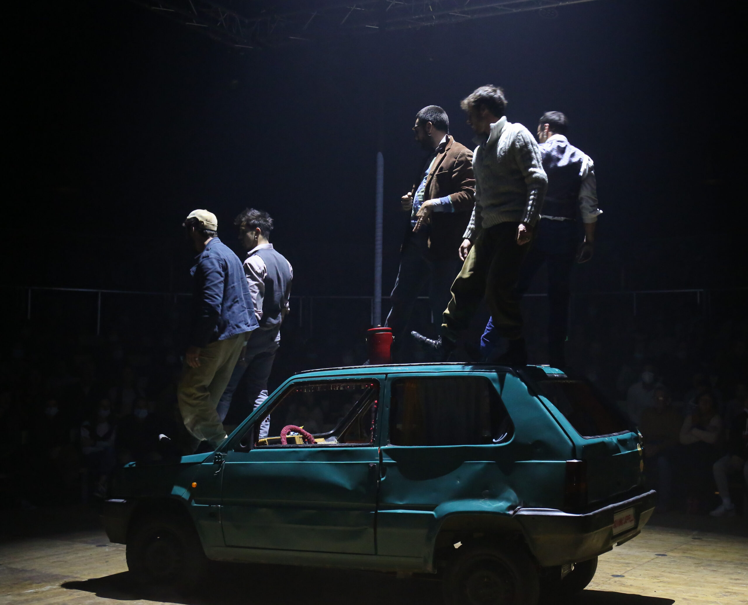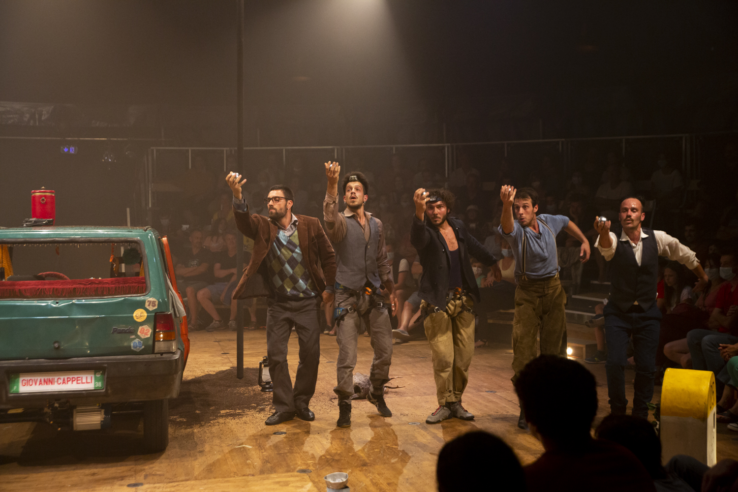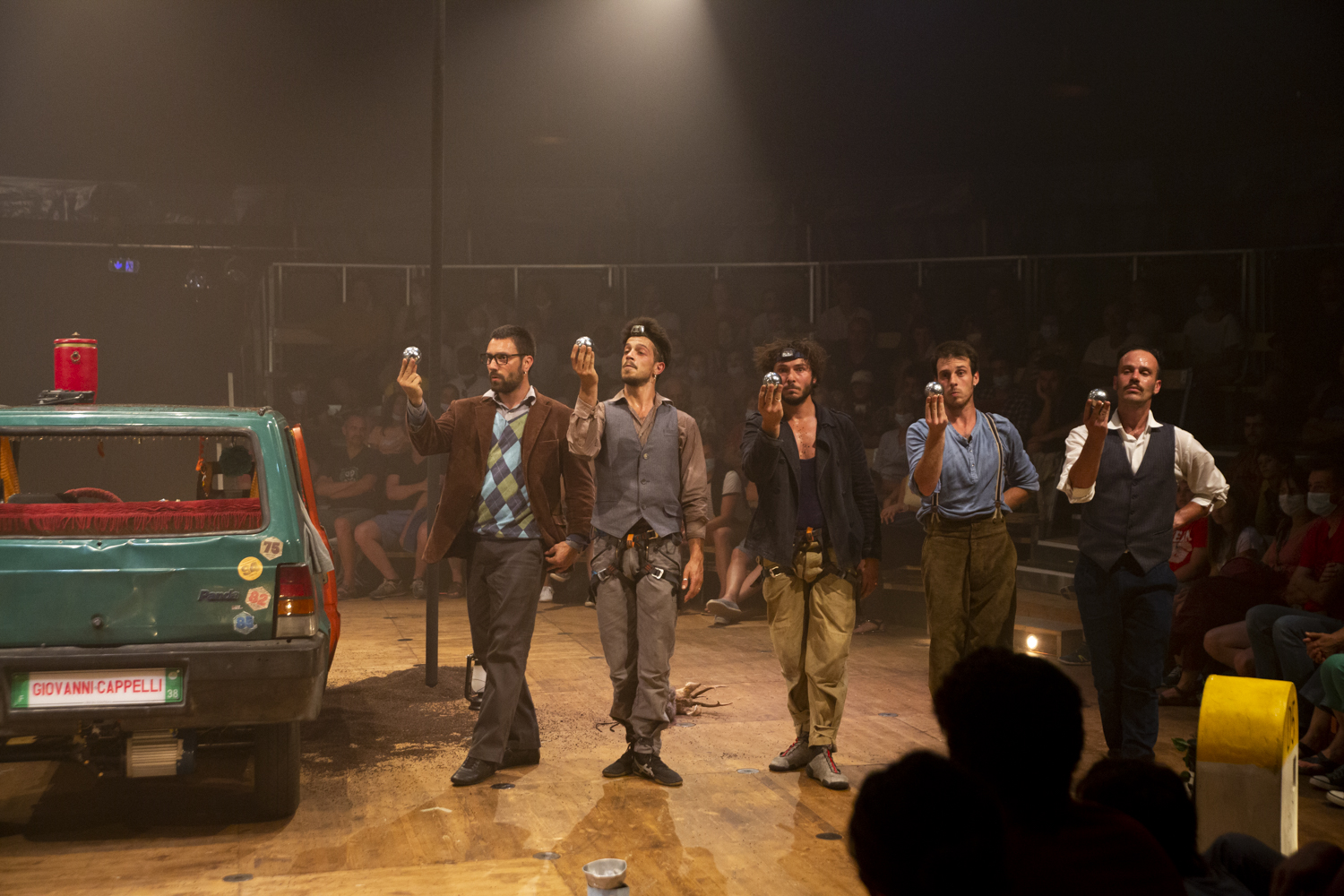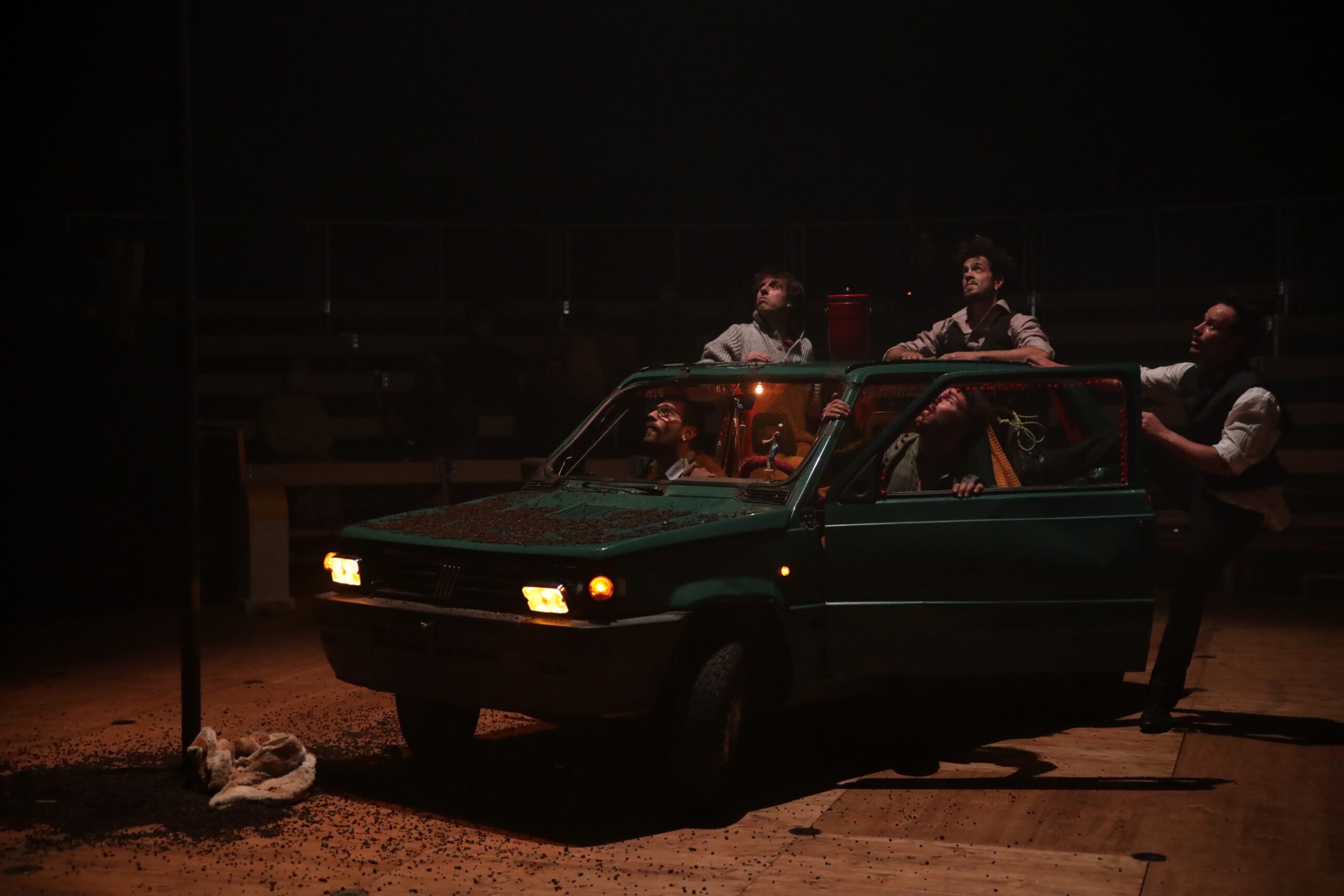 Pandax, c’est d’abord une idée : installer une voiture sous le chapiteau, et construire autour un scénario tissé d’acrobaties. Entassés dans une Fiat Panda vert foncé, les cinq acrobates jouent cinq frères, de retour de la crémation de leur père avec l’urne funéraire. Ils roulent, se disputent et apparaissent alors portés acrobatiques, lancer de couteaux, gags divers, mât chinois, bascule… Au son des chansons jazz et klezmer interprétées en direct par trois musiciennes, ils déroulent leur récit, tandis que leurs corps s’envolent de plus en plus haut.