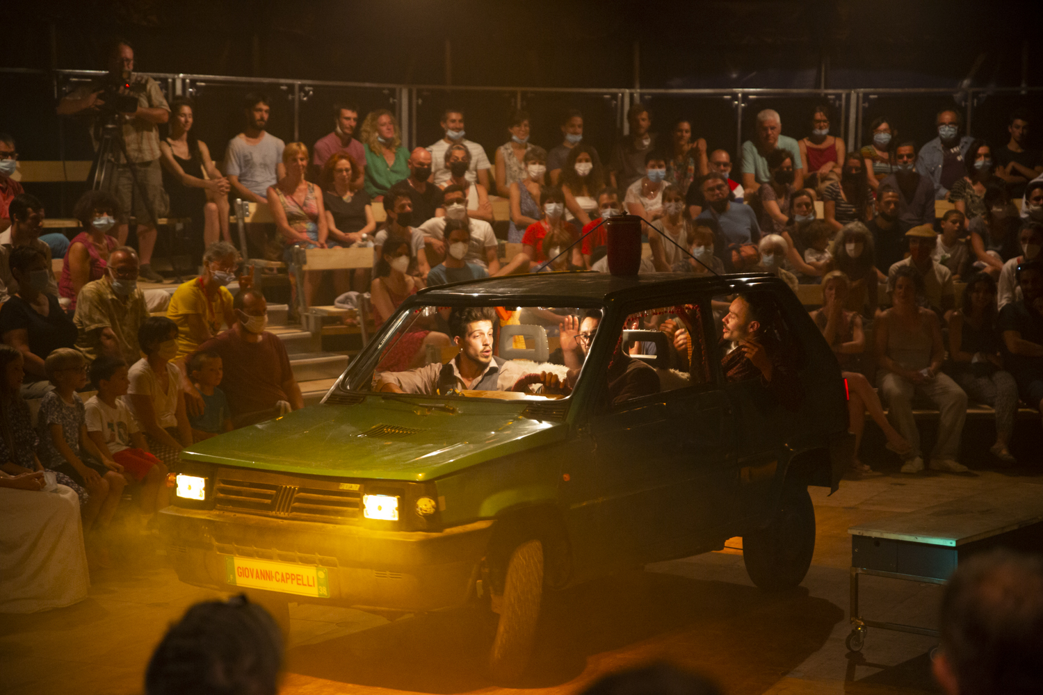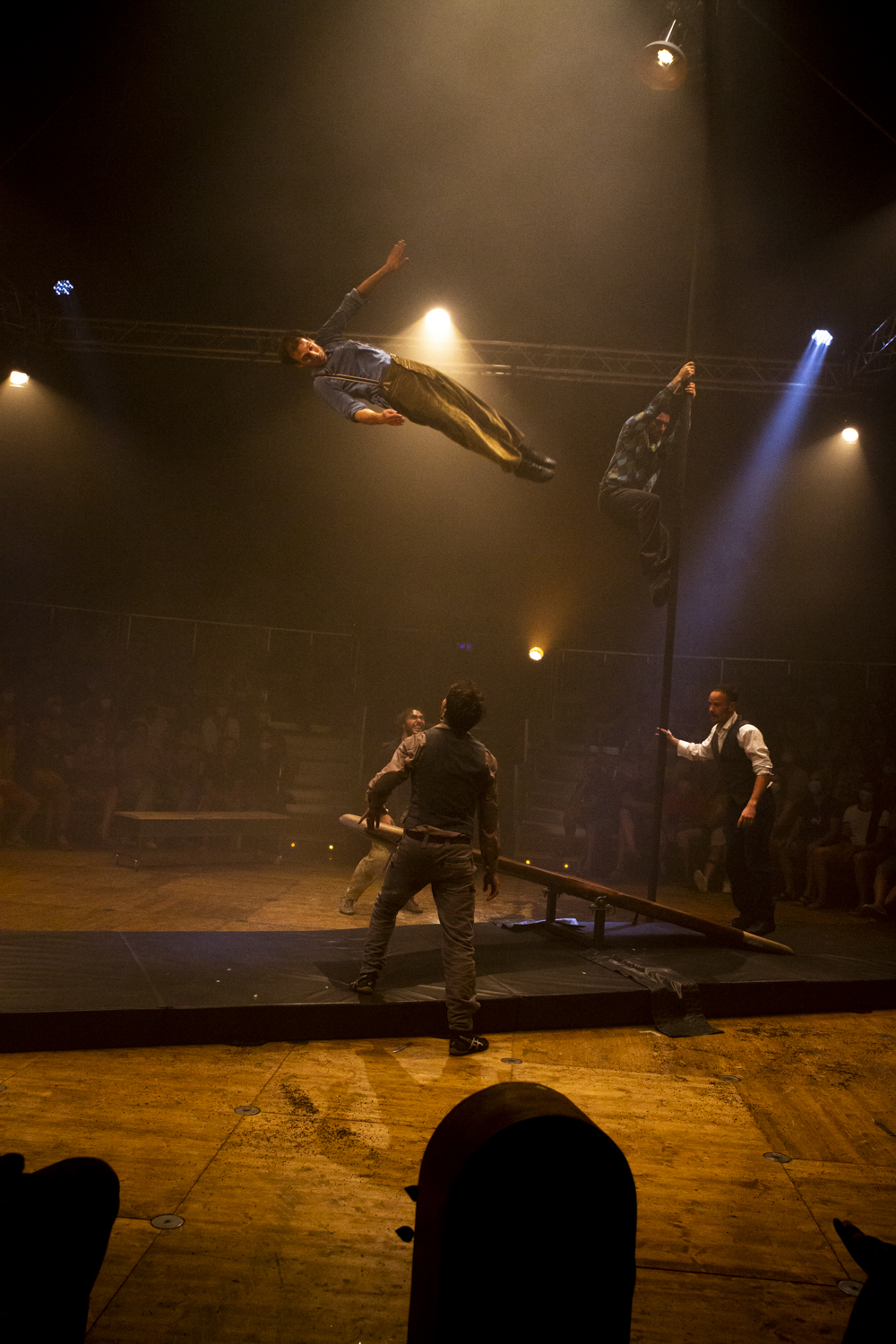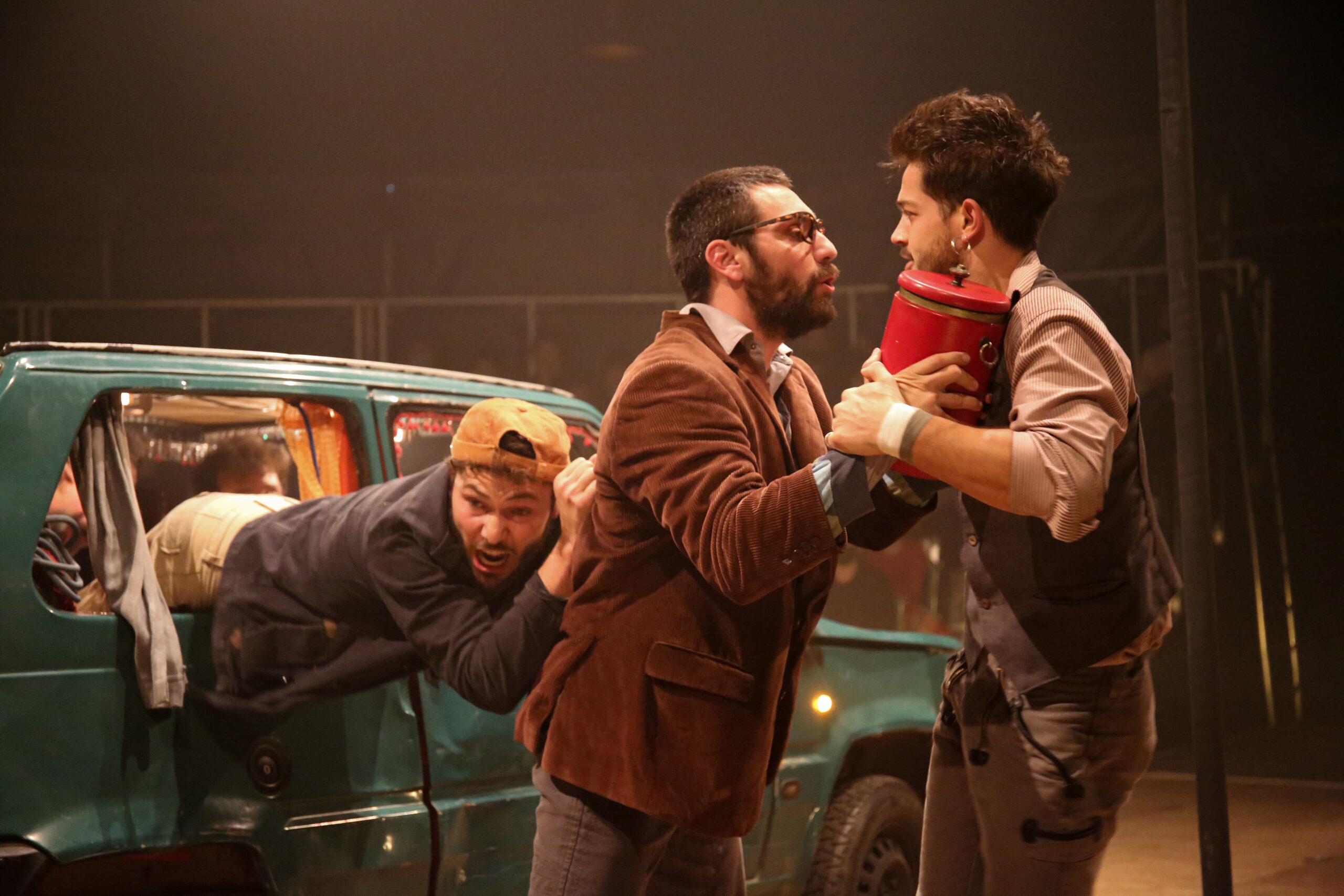 Pandax, c’est d’abord une idée : installer une voiture sous le chapiteau, et construire autour un scénario tissé d’acrobaties. Entassés dans une Fiat Panda vert foncé, les cinq acrobates jouent cinq frères, de retour de la crémation de leur père avec l’urne funéraire. Ils roulent, se disputent et apparaissent alors portés acrobatiques, lancer de couteaux, gags divers, mât chinois, bascule… Au son des chansons jazz et klezmer interprétées en direct par trois musiciennes, ils déroulent leur récit, tandis que leurs corps s’envolent de plus en plus haut.