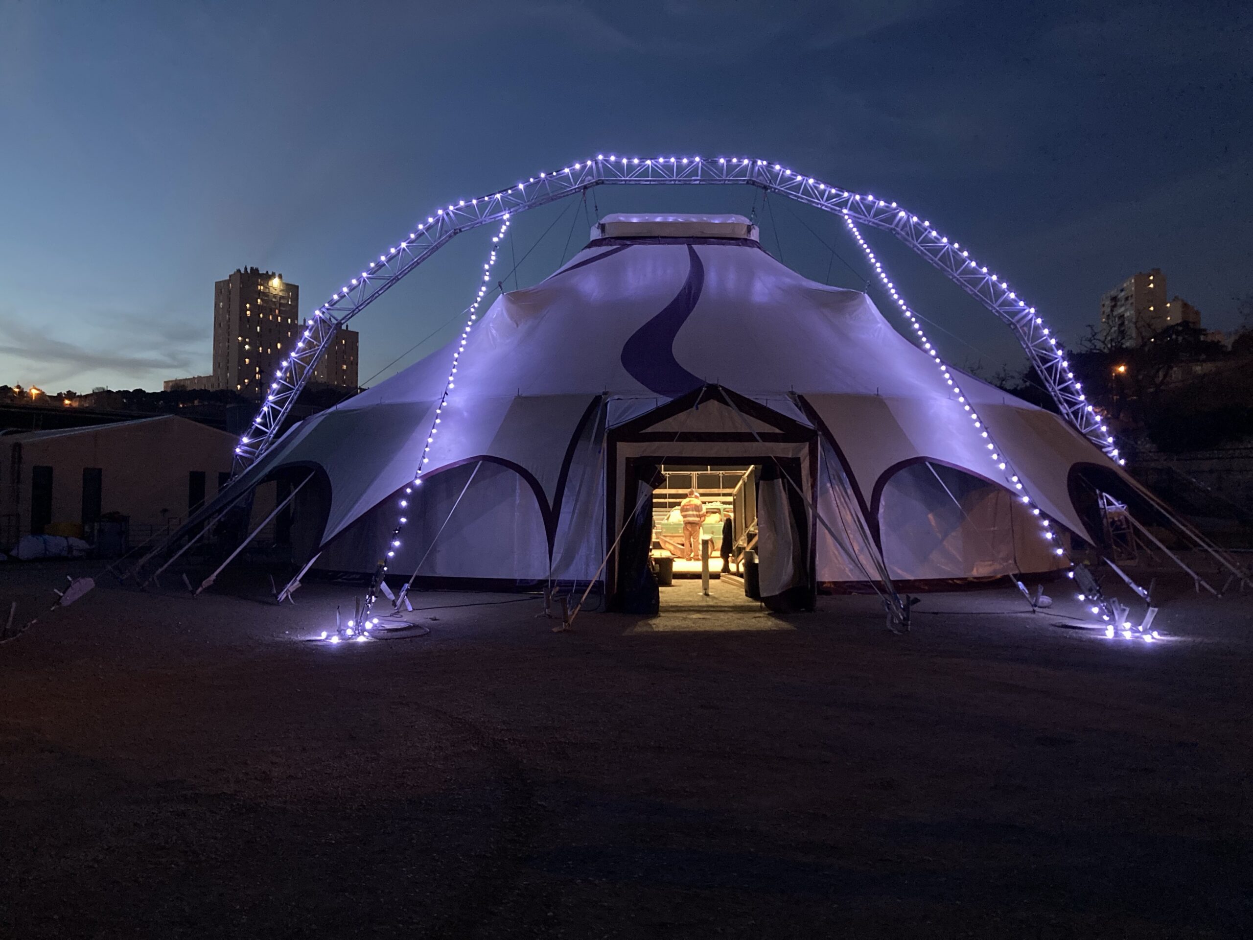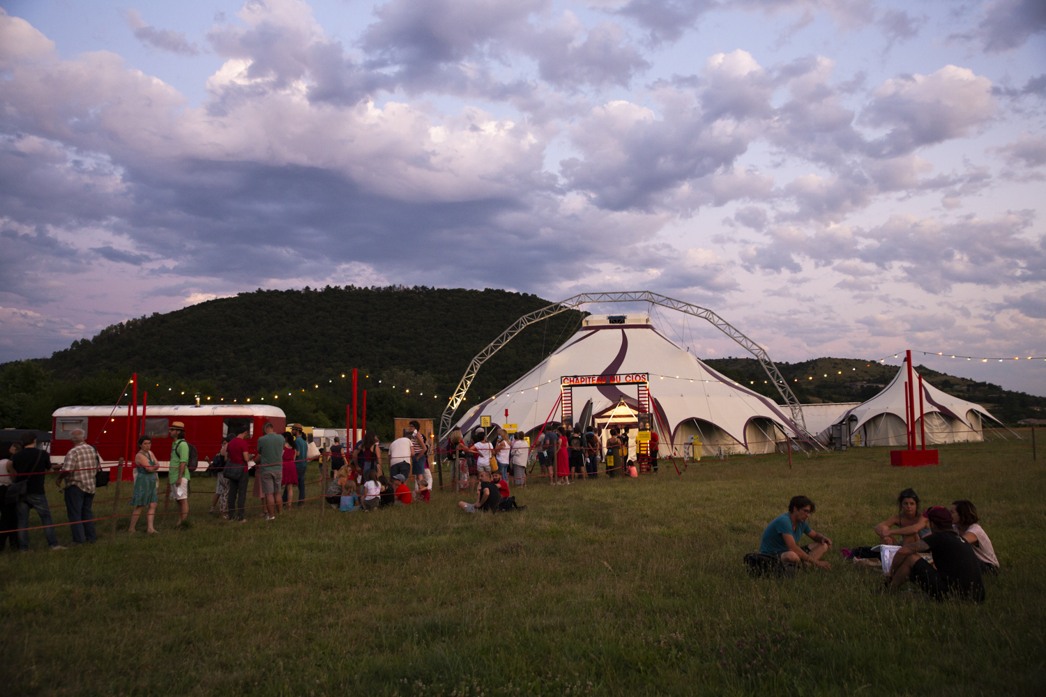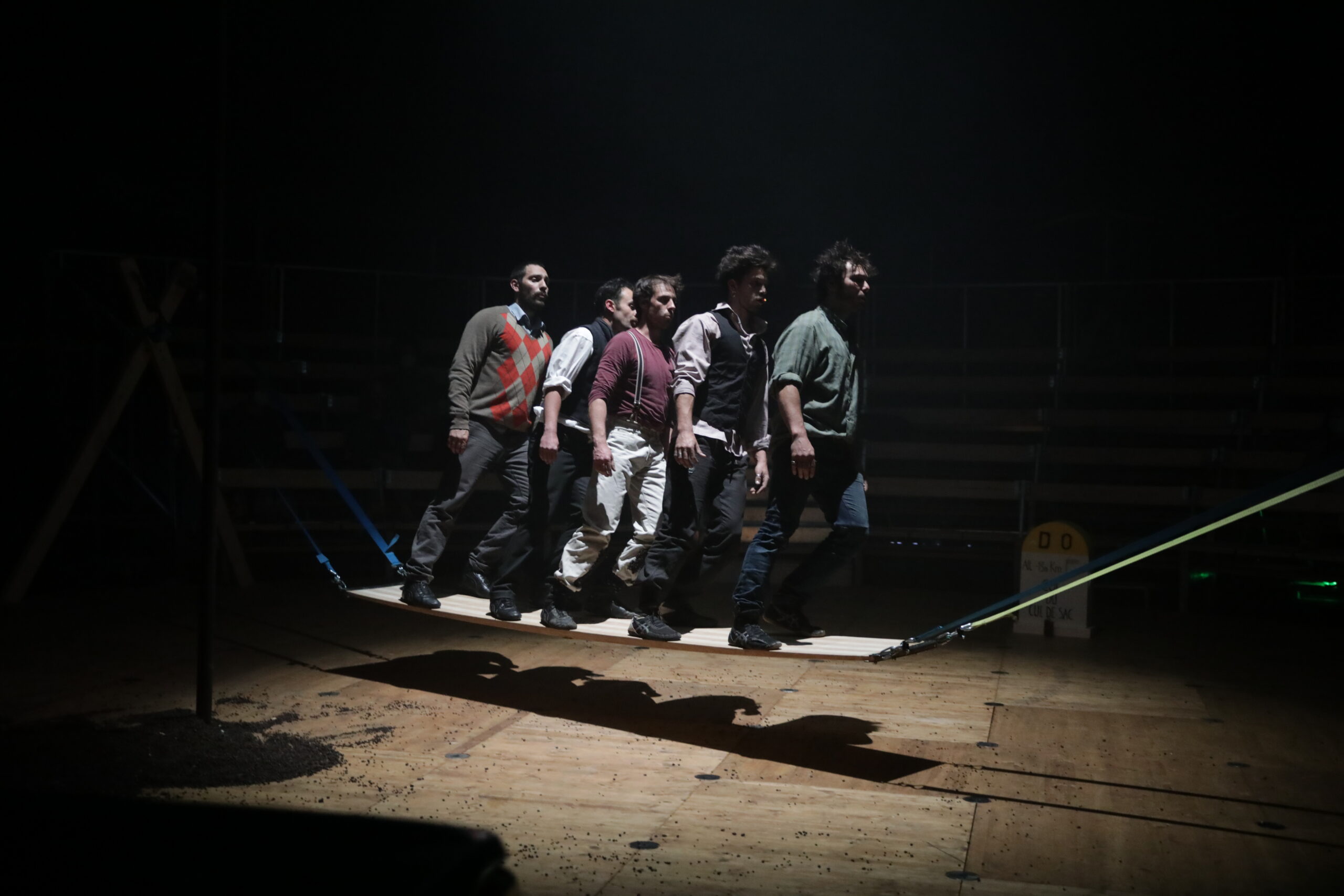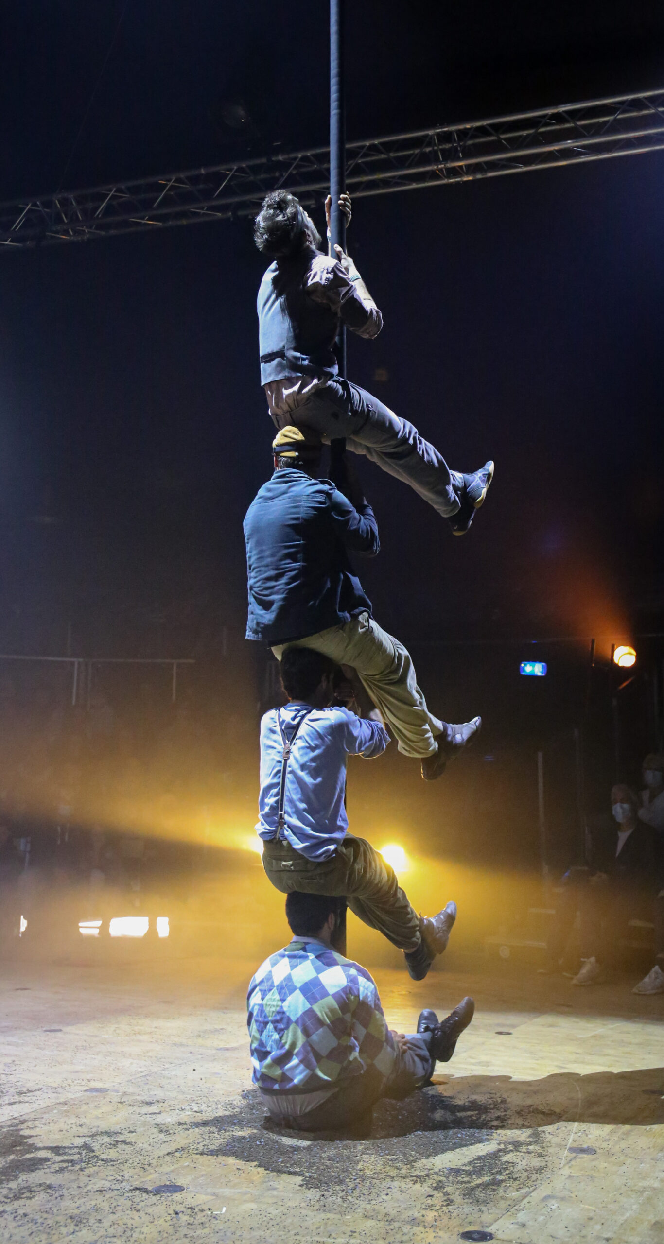 Pandax, c’est d’abord une idée : installer une voiture sous le chapiteau, et construire autour un scénario tissé d’acrobaties. Entassés dans une Fiat Panda vert foncé, les cinq acrobates jouent cinq frères, de retour de la crémation de leur père avec l’urne funéraire. Ils roulent, se disputent et apparaissent alors portés acrobatiques, lancer de couteaux, gags divers, mât chinois, bascule… Au son des chansons jazz et klezmer interprétées en direct par trois musiciennes, ils déroulent leur récit, tandis que leurs corps s’envolent de plus en plus haut.