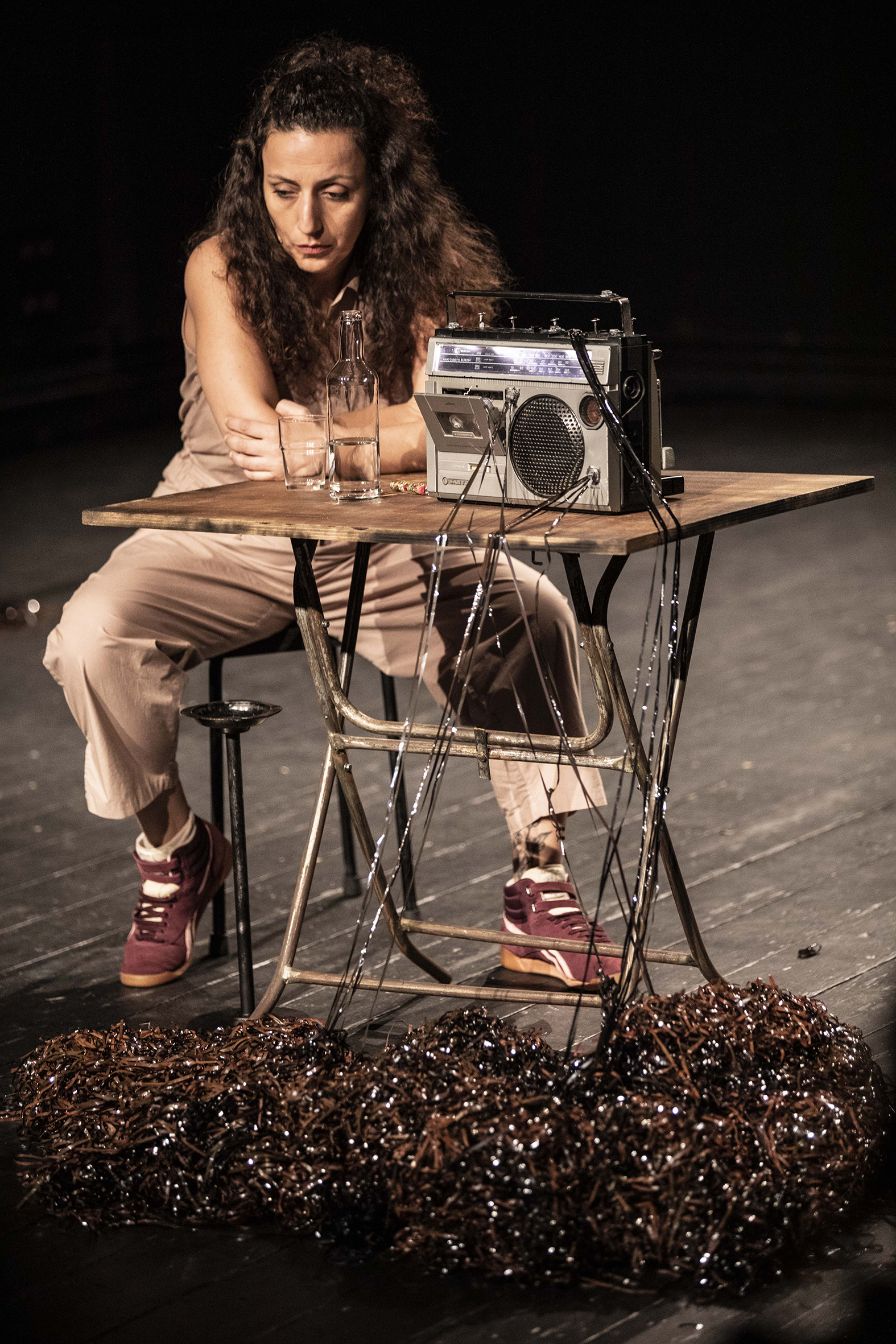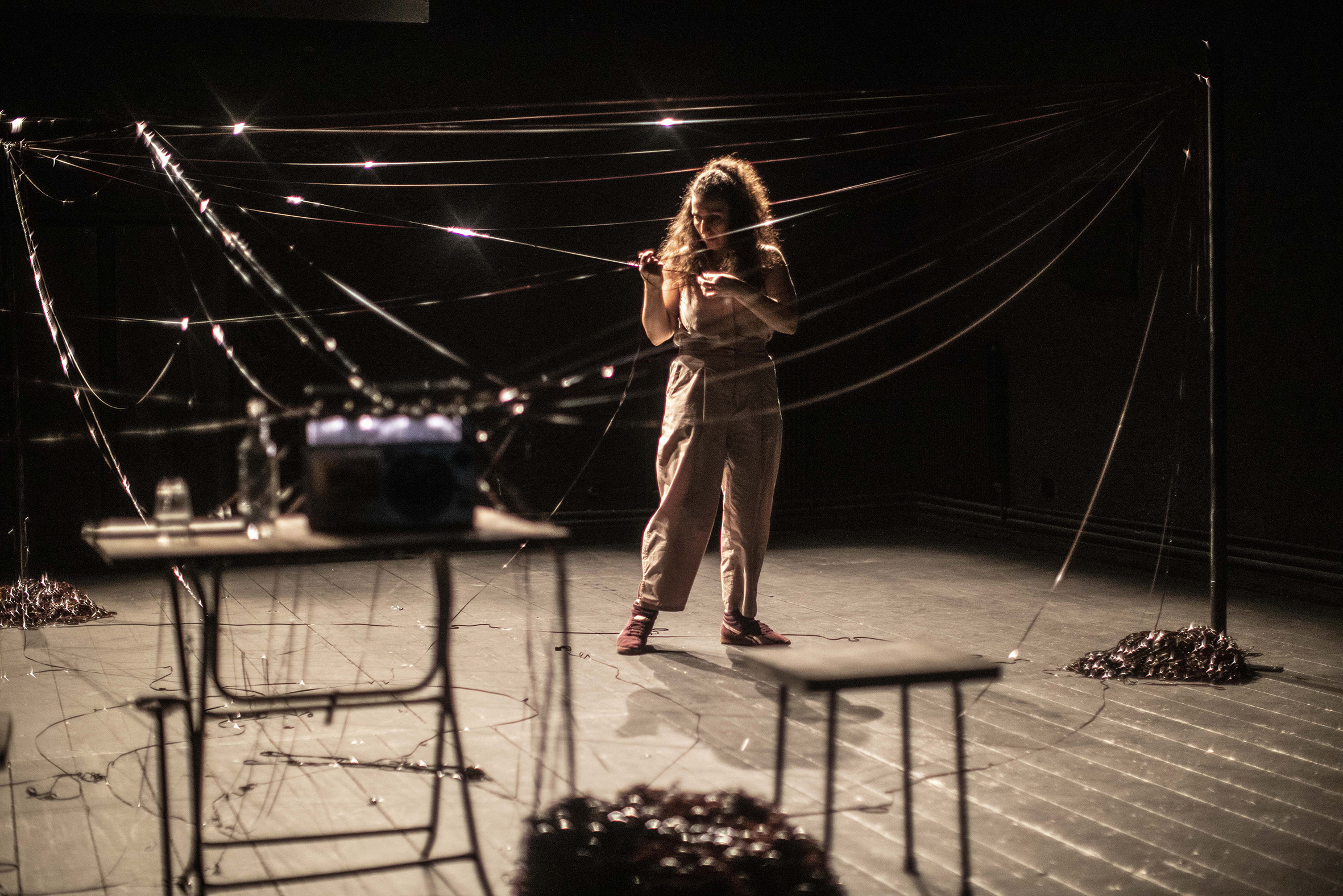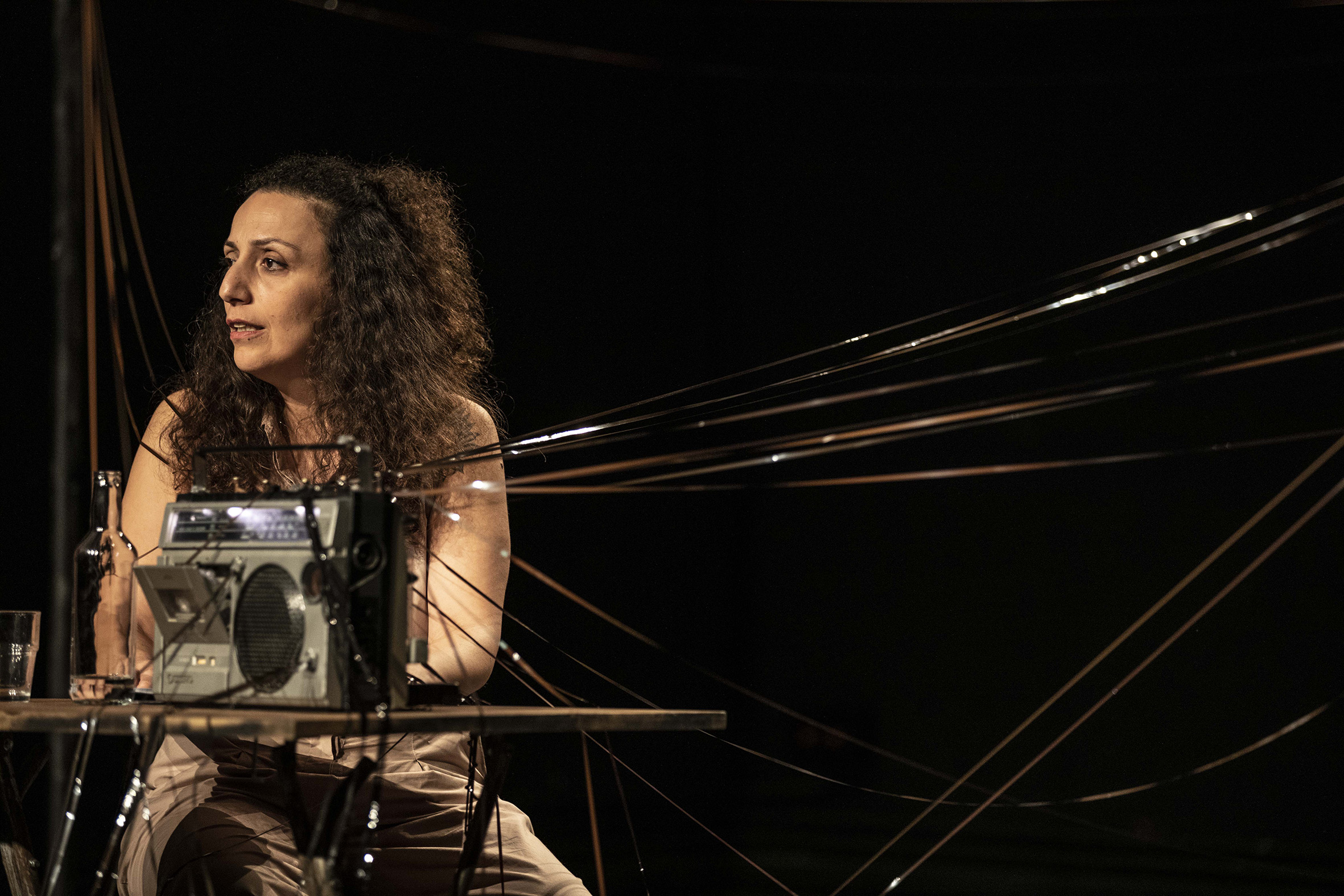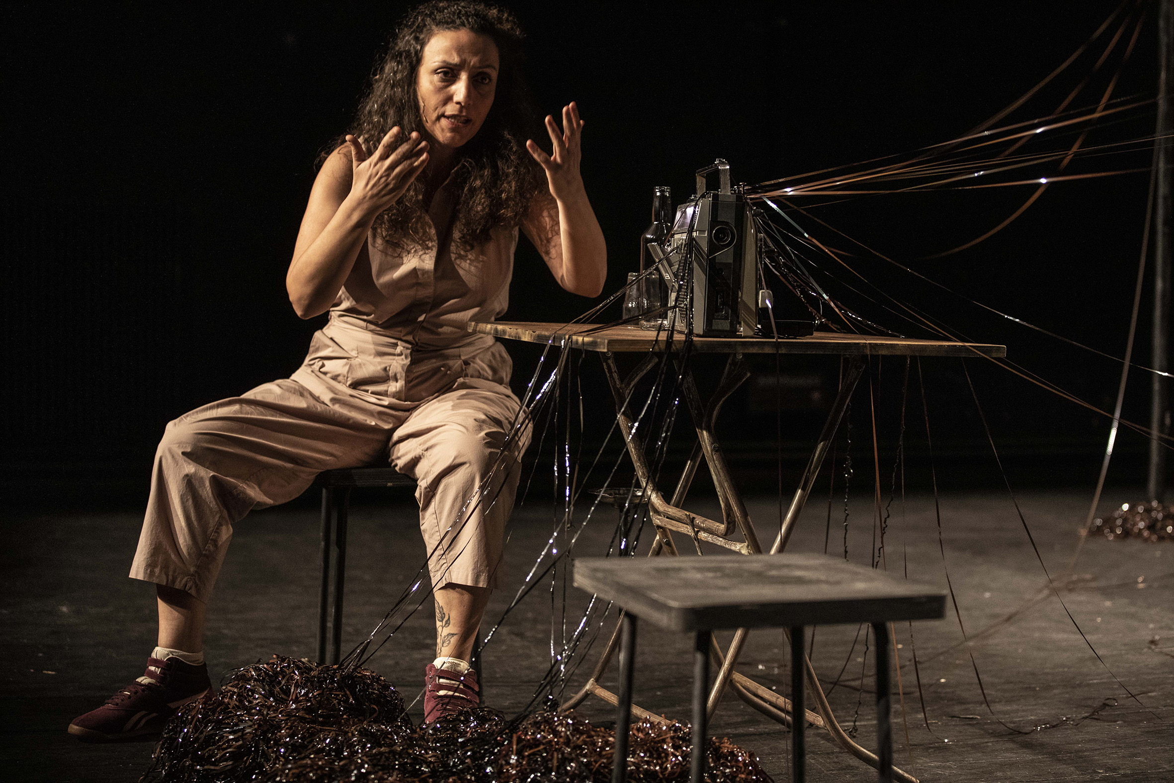 À la voix de l’infirmière, militante communiste, se joignent notamment celles d’un médecin palestinien, d’un reporter de guerre suédois et d’un responsable de la Croix-Rouge internationale. Les questions de l’engagement, de la trace, de la répétition de l’Histoire, sont au cœur du travail de l’artiste libanaise Chrystèle Khodr, qui porte avec une constante dignité ce seule-en-scène, à la scénographie très inventive, imprégné des échos des événements récents du Moyen-Orient.